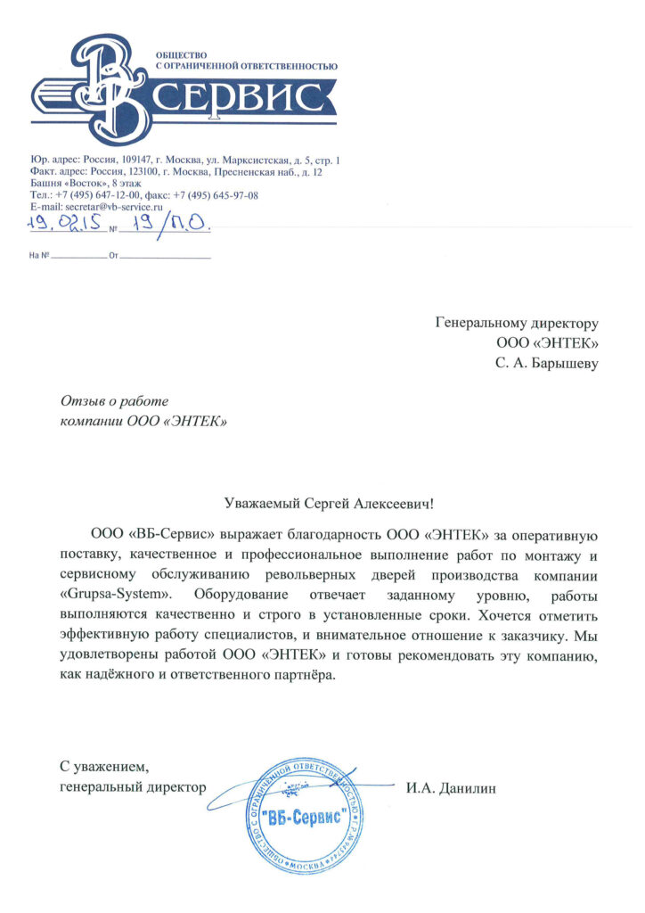 ООО «ВБ-Сервис» выражает благодарность ООО «Энтек» за оперативную поставку, качественное и профессиональное выполнение работ по монтажу и сервисному обслуживанию револьверных дверей производства компании «Grupsa-System».